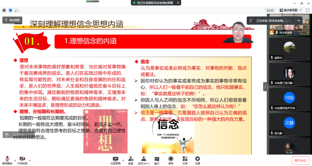 课上,陈洋安副书记首先抛出理想与信念两个概念,引起学员们的兴趣。他指出理想是对未来事物的美好想象和希望,也比喻对某事物臻于最完善境界的观念。理想与幻想不同,我们要区别好两者差别。信念是一种需要、它是激励人按照自己认为正确的观点、原则去行动去实现目标的一种强大的内在力量。我们要继续坚持正确理想信念,让自己在入党的过程中,努力提升自我,面对诱惑能克制自己,让自己不忘初心牢记使命,赓续红色血脉,永远把伟大建党精神继承下去、发扬光大!