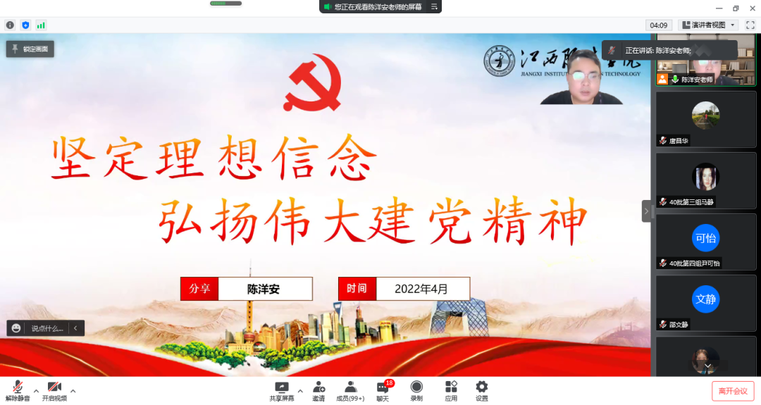 陈洋安副书记围绕,以“深刻理解理想信念思想内涵”、“伟大建党精神筑牢理想信念”、“努力争做堪当重任时代新人”三个方面为我们解惑在入党过程中遇到的难题,我们要学深悟透践行伟大建党精神,就要明白自己为了什么入党,以及自己的入党初心是否可以坚持。