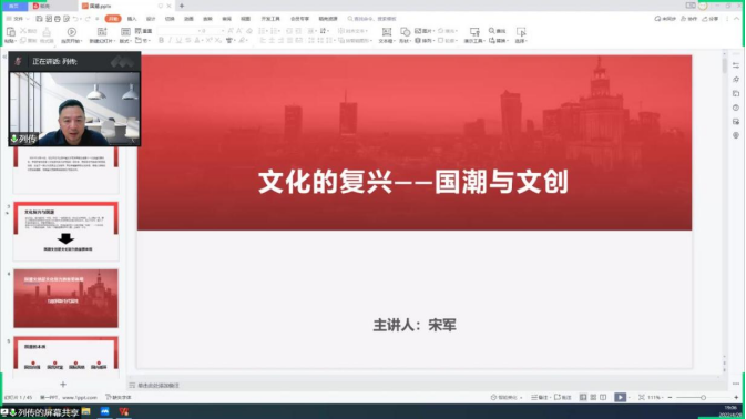 4月28日晚,应时尚传媒学院之邀,南昌航空大学艺术与设计学院副院长、教育部高等学校动画、数字媒体专业教指委委员、文旅部动漫高端人才库专家、江西省新文科建设专家小组专家、江西省动画本科专业教指委副主任宋军教授为时尚传媒学院师生做了一场题为《文化的复兴——国潮与文创》的线上讲座,全院200余名师生参加,讲座由副院长李有为主持。