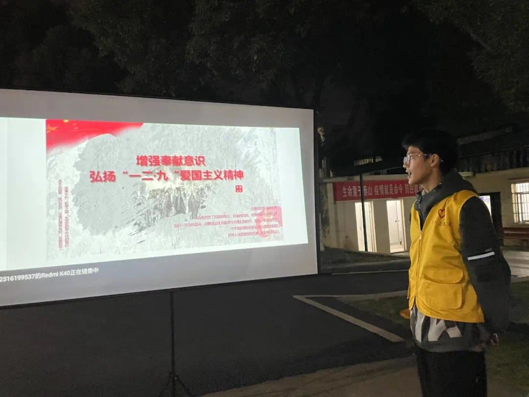 今天下午5:30开展“纪念一二九,传承爱国情”主题演讲观影活动 学生会组织露天电影《八佰》走入银幕,将鲜活生动的革命先锋的形象呈现在大家眼前。无数个抗战英雄用鲜血来守护我们所热爱的土而这份热爱也必将激励着无数中华儿女为实现中华民族的伟大复兴而不懈奋斗!勿忘国耻,铭记历史,方显初心。