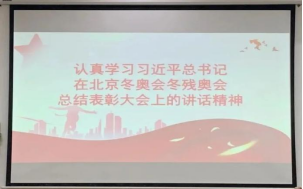 全体人员观看习近平总书记在总结表彰大会上讲话的视频。大会上,习近平总书记阐述了胸怀大局、迎难而上、追求卓越、共创未来的北京冬奥精神。“北京冬奥会、冬残奥会是中国人民爱国热情的激扬展示。”习近平总书记在讲话中以一个个“广大”讴歌和赞颂亿万中国人民——拼搏的运动员、教练员,奋战的场馆建设者,热情的志愿工作者等。