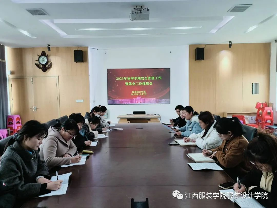 为深入学习贯彻教育部印发《关于做好2024届全国普通高校毕业生就业创业工作的通知》促进2024届毕业生就业创业,2023年12月7日下午,服装设计学院于清源一栋四楼学院会议室召开了2023年秋季学期学生管理工作暨就业工作推进会。出席本次会议的有党委书记蓝岚、党委副书记周洪英、学工办主任张敬玲、全体辅导员、班主任参加会议。