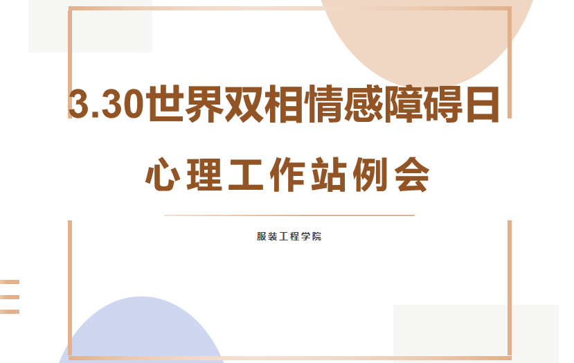 服装工程学院讯(撰稿 马致远)3月30日是世界双向情感障碍日,为进一步提高服装工程学院学生心理素质,普及和宣传心理健康知识,增进同学们对双向情感障碍症的了解,筑牢心理健康防线,3月30日晚7:00时,服装工程学院召开了各班级心理委员会议,辅导员李静雯和各班心理委员参加了此次会议,会议由王彤主持。受疫情影响,本次会议通过线上形式进行。