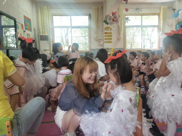 下午两点,志愿者们带好化妆工具到来位于我校清源区江服时尚幼儿园内与小朋友们见面。志愿者们以3人一小组为单位,分工合作,有人画眉毛,有人打底妆,有人化眼影等等。虽然化妆过程很辛苦,志愿者们依然干劲十足,精神抖擞。