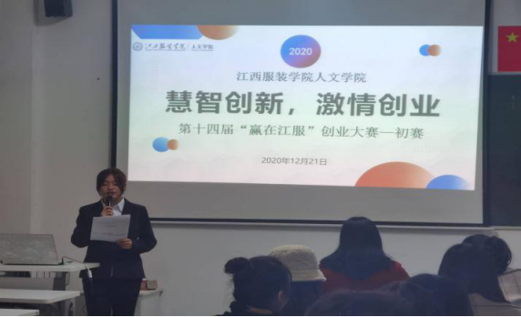 为积极响应国家“大众创业,万众创新”号召,进一步贯彻落实《关于组织开展第十四届“赢在江服”创业大赛暨第十七届”挑战杯”大学生课外学术科技作品竞赛校内选拔赛有关工作的通知》(江服创字〔2020〕11号)精神,12月21日晚6:00时,人文学院在主教学楼114多媒体教室举行了第十四届“赢在江服”创业大赛初赛。