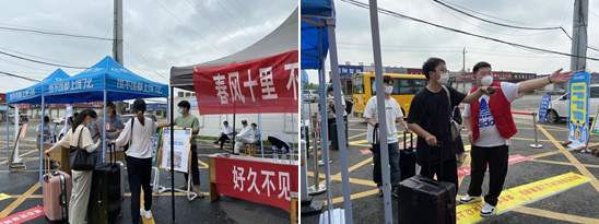从7月1日-6日,艺术设计学院的辅导员和志愿者们从早上7:00开始就在校门口等待着毕业生的回家,协助校园保卫人员一起有序引导返校毕业生们做好安全消毒、验证健康码、体温检测、身份核验、入校登记等工作。毕业生进入校园后,引导学生们前往学生宿舍、辅导员(班主任)办公室等部门办理毕业离校手续和领取毕业材料。
