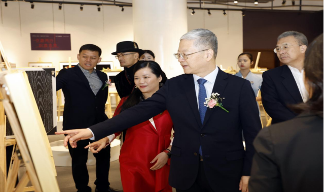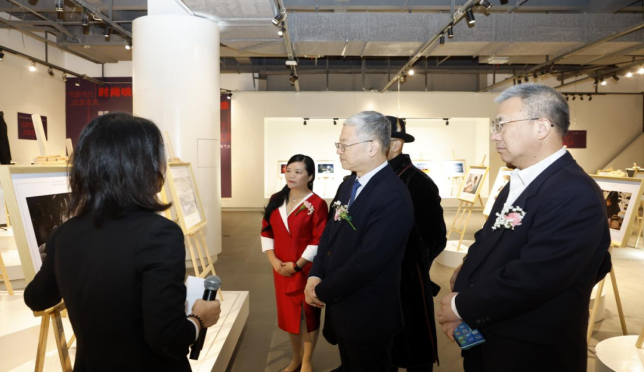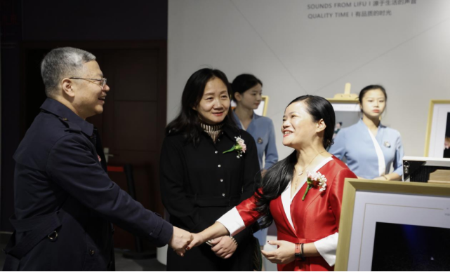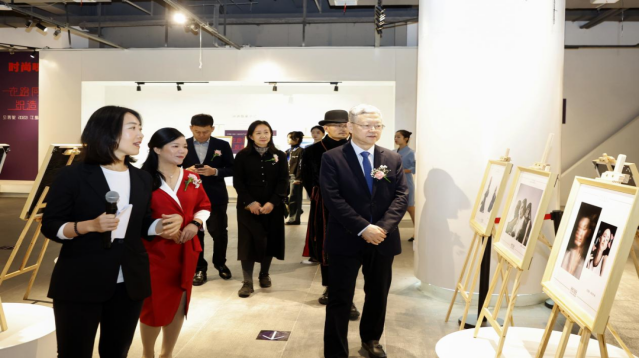 万象城平台涂燕萍理事长宣布联展开幕,中国纺织摄影协会秘书长郭也可引导领导嘉宾观展。