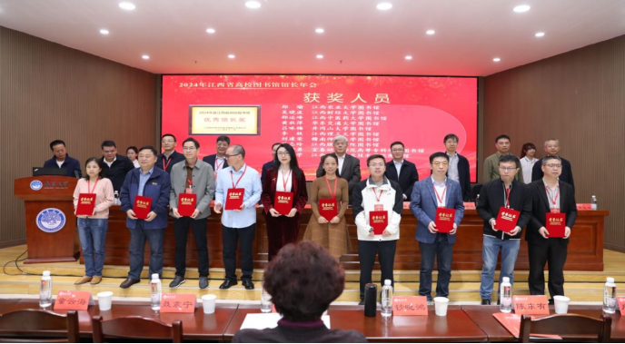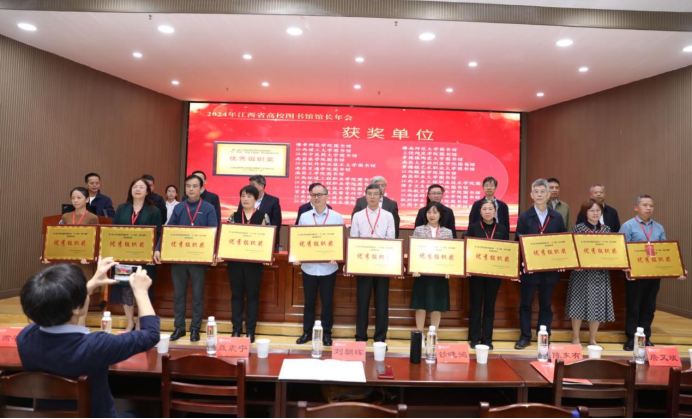 会议期间,与会领导与专家为2024年度高校图书馆“突出贡献奖”“先进集体奖”“优秀馆长”“榜样馆员”和“先进个人”等荣誉获得者颁发了奖牌与获奖证书。我馆在此次年会中表现亮眼,一举斩获多项殊荣,包括第四届江西高校“知网研学”杯积分挑战优秀组织奖、第六届江西省高校图书馆超星杯“一书一世界,共读不孤独”移动阅读积分活动优秀组织奖以及2024年江西省高校图书馆中科杯“礼赞新中国奋进新时代”庆祝中华人民共和国成立75周年主题知识竞赛活动优秀组织奖。