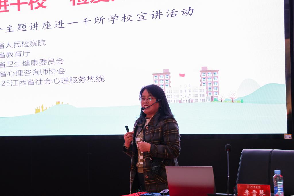 新闻中心讯(文/ 江宣)为深化学生法治宣传和心理健康教育,丰富学生法律知识,促进青年学生身心健康成长,11月29日,由江西省人民检察院、江西省教育厅、江西省卫生健康委员会主办,江西省心理咨询师协会、966525江西省社会心理服务热线协办的“法治心育进千校 检爱同行护成长”五个主题讲座进一千所学校宣讲活动走进万象城平台。保卫处处长鲍鹏主持讲座。全校辅导员、心理课教师,各班级心理委员,江服新青年普法协会成员参加讲座。