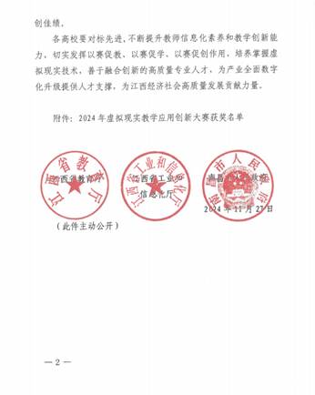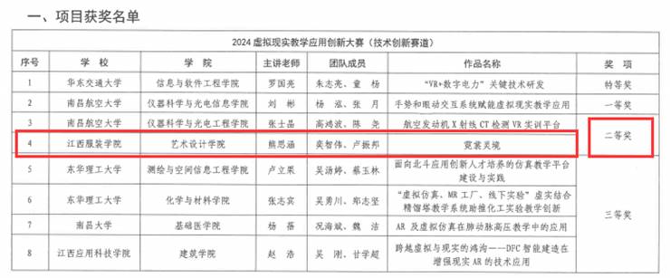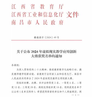 新闻中心讯(教务处陈佳颖撰稿)11月28日,江西省教育厅发布了《关于公布2024年虚拟现实教学应用创新大赛获奖名单的通知》,我校教师熊思涵及其团队凭借其作品《霓裳灵境》脱颖而出,荣获2024年虚拟现实教学应用创新大赛(技术创新赛道)二等奖,我校获得高校优秀组织奖。这不仅是对我校在虚拟现实技术与教育教学深度融合领域探索的肯定,也是对我校师生创新精神和实践能力的极大鼓励。