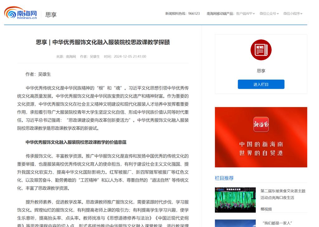 新闻中心讯(马克思主义学院供稿)近日,海南日报理论评论部和南海网联合主办的理论频道理上网来专栏发表我校马克思主义学院吴雄生副教授的理论文章《中华优秀服饰文化融入服装院校思政课教学探赜》。