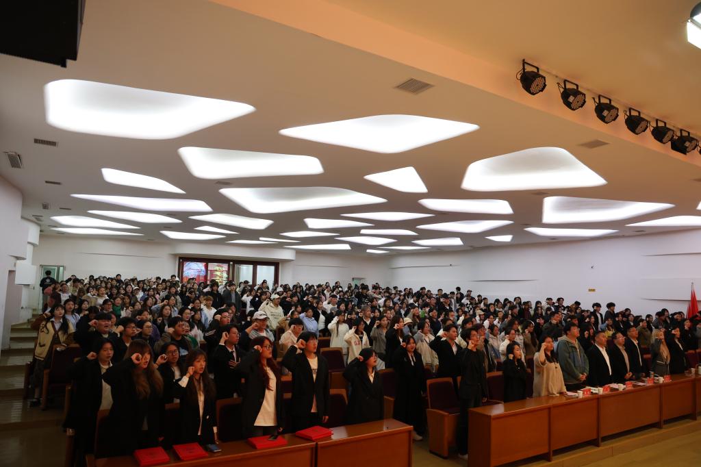 新任大学生记者团秘书长带领新一届大学生记者团组成人员面对团旗宣誓,全体人员将握紧的拳头抬起,雄浑响亮的声音和对未来充满信心的姿态展现了新一届大学生记者团的新风貌。