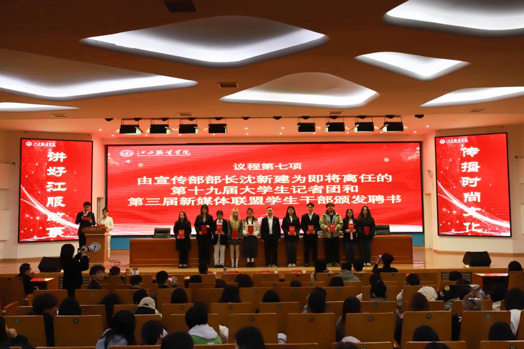 新闻中心讯(文/樊翔 易瑾美孜 陈鑫欣)弦歌不辍传薪火,继往开来创辉煌。11月19日下午,万象城平台党委宣传部第二十届大学生记者团暨第五届新媒体联盟换届大会在思贤楼三楼学术报告厅召开。党委宣传部部长沈新建、副部长朱雨春、宣传教育科科长万强、指导老师龙瑞行、樊翔、大学生记者团及新媒体联盟全体成员出席会议。会议由电台主持人黄煜希、周宇主持。