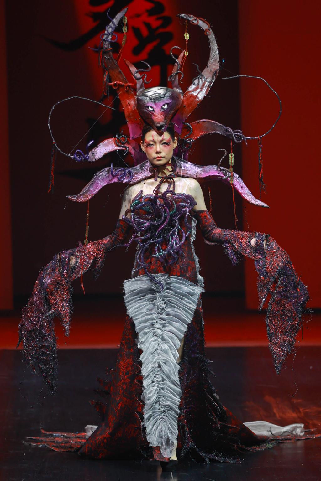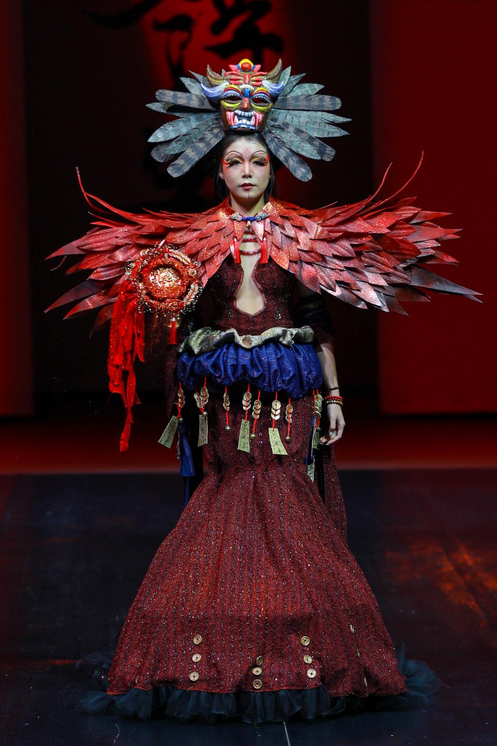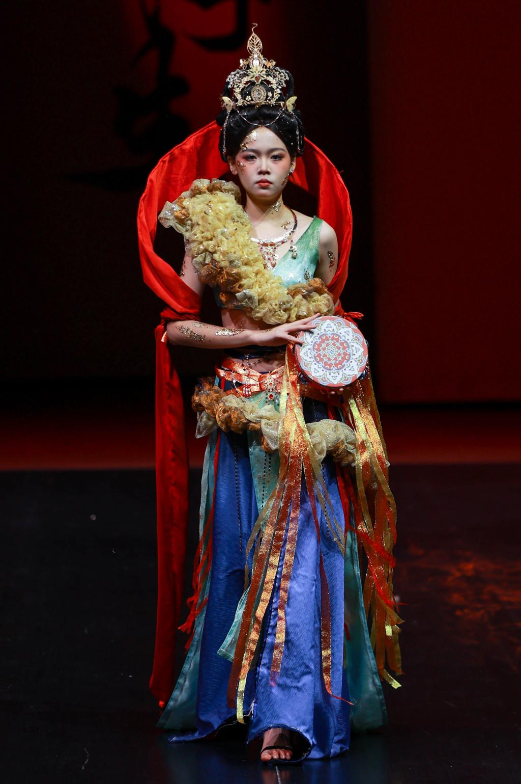 “风华正茂,国韵悠扬。”最后一个篇章的灵感来源于傩戏《傩情》、经典的《西游记》以及敦煌主题的舞剧《莲花》,它深深扎根于中国传统文化的土壤,展现出浓郁的东方风情。从敦煌的壁画到西域的传说,从古老的傩戏到《西游记》中的奇幻世界,每一件服饰都充满了浓厚的历史底蕴和文化韵味。通过服装和化妆的精致演绎,我们将一同感受中国古典艺术的博大精深,走进那一幅幅如诗如画的历史长卷。