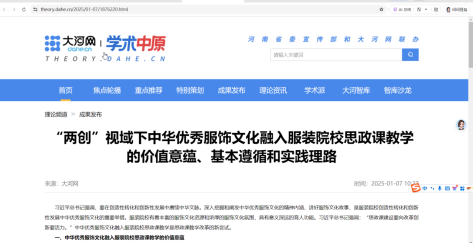 新闻中心讯(供稿:马克思主义学院)近期,河南省委宣传部和大河网联办的学术中原理论频道成果发布专栏发表我校马克思主义学院吴雄生副教授的理论文章《“两创”视域下中华优秀服饰文化融入服装院校思政课教学的价值意蕴、基本遵循和实践理路》。
