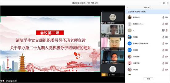 服装设计学院讯(记者 付裕)为做好疫情防控期间入党积极分子的培养、教育和考察工作,进一步端正学生入党动机,确保新发展党员质量,5月13日下午,服装设计学院线上举行第二十九期入党积极分子培训班开班仪式。会议由院学生党支部组织委员吴圣琦主持,莅临开班仪式的领导老师有服装设计学院党总支副书记邓良峰同志、副书记王春梅同志,院学生支部书记张敬玲同志,院学生支部宣传委员晋可同志,纪检委员朱慧雪同志,以及服装设计学院参加29期党课全体学员。