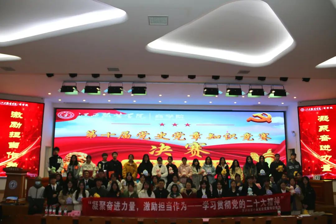 为学习贯彻习近平总书记在党史学习教育动员大会上关于抓好青少年学习教育的重要讲话精神,进一步引导入党积极分子们厚植爱党、爱国、爱社会主义的情感,让红色基因、革命薪火代代传承。2023年12月13日晚,商学院在思贤楼举办以“凝聚奋进力量,激励担当作为——学习贯彻党的二十大精神”为主题的第十届党史党章知识竞赛。莅临竞赛的领导老师有商学院组织员、学生第二党支部书记周青老师,商学院辅导员、学生第一支部组织委员罗玲老师,商学院辅导员、学生第二党支部宣传委员卢佳琪老师以及商学院辅导员阮煌胜老师,此次竞赛由杨丹丹和王强主持。