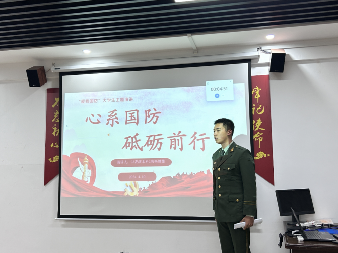 本次比赛通过赛前抽签方式决定出场顺序,在主持人结束介绍后,比赛正式开始。参赛选手以“爱我国防”为主题,结合自身经历,阐述自己的观点。国防教育是提高全民素质、培塑民族精神的重要途径,是全面推进国防和军队现代化的基础性工程,是凝聚实现中国梦强军梦强大力量的战略之举、长远之策。