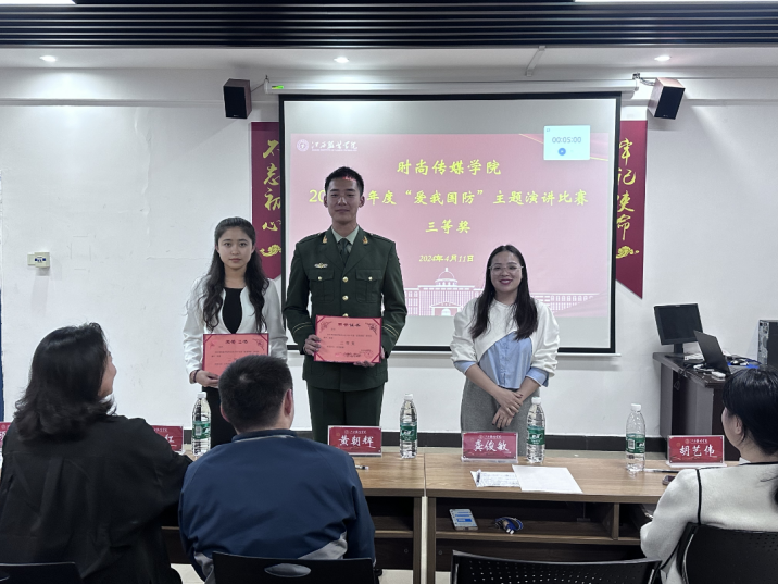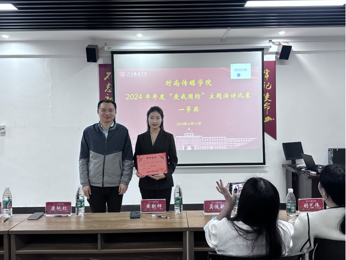时尚传媒学院讯 为深入学习贯彻习近平强军思想,推动新时代全民国防教育工作的深入普及。时尚传媒学院于2024年4月11日隆重举行“爱我国防”主题演讲比赛。参加此次比赛的领导老师分别有时尚传媒学院党委副书记黄朝辉老师,时尚传媒学院康红艳老师、胡艺伟老师、龚俊敏老师以及顾成龙同学担任评委。