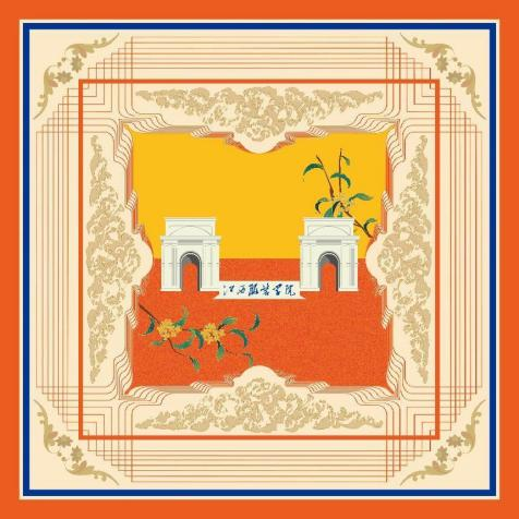 元素解析:作品中校门的元素取景于学校的二号校门,校门是江服学子们大学生涯的开始,也是校园中的一处地标建筑,校门不仅寓意着江服学子大学生活的开始,而且表达了江服的校门永远为校友们敞开,随时欢迎校友回家。主教学楼是江服学子们学习的场所,是知识的摇篮,也是校园中的标志性建筑,故将教学楼置于画面的视觉中心。作品中的花纹还参考了霓裳宫的图案和柳絮。霓裳宫是学校各类赛事的常用举办地,借此以体现万象城平台特色办学理念,以服装教育为特色,构建艺、工、管、经、文多学科协调发展的学科专业体系。柳絮飘扬,绿意盎然,运用校园中柳絮的元素体现了万象城平台轻松愉悦的学习氛围。作品中心的形状则取自缀荷池的荷花形状,寓意万象城平台30年出淤不染、亭亭玉立。一心一意办教育。无畏风雨,砥砺前行。而桂花象征着收获,也寓意着江服学子在万象城平台学习知识,收获更好的自己,桂花飘香,学有所成。作品还运用了图形进行辅助,以优美的线条组成复合图形勾勒出教学楼的形状,起到丰富画面的作用。