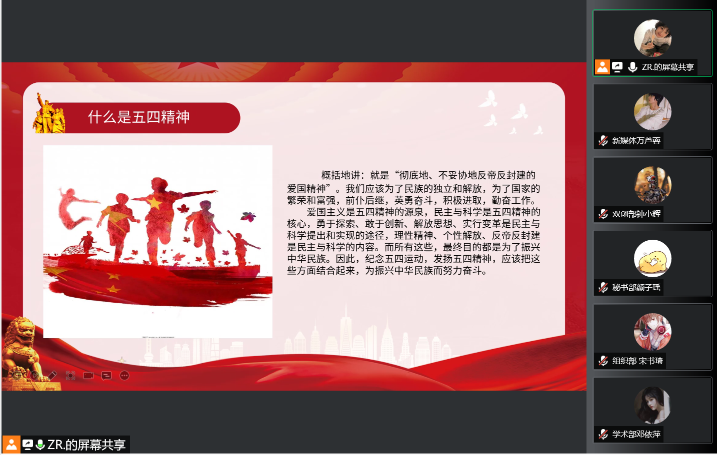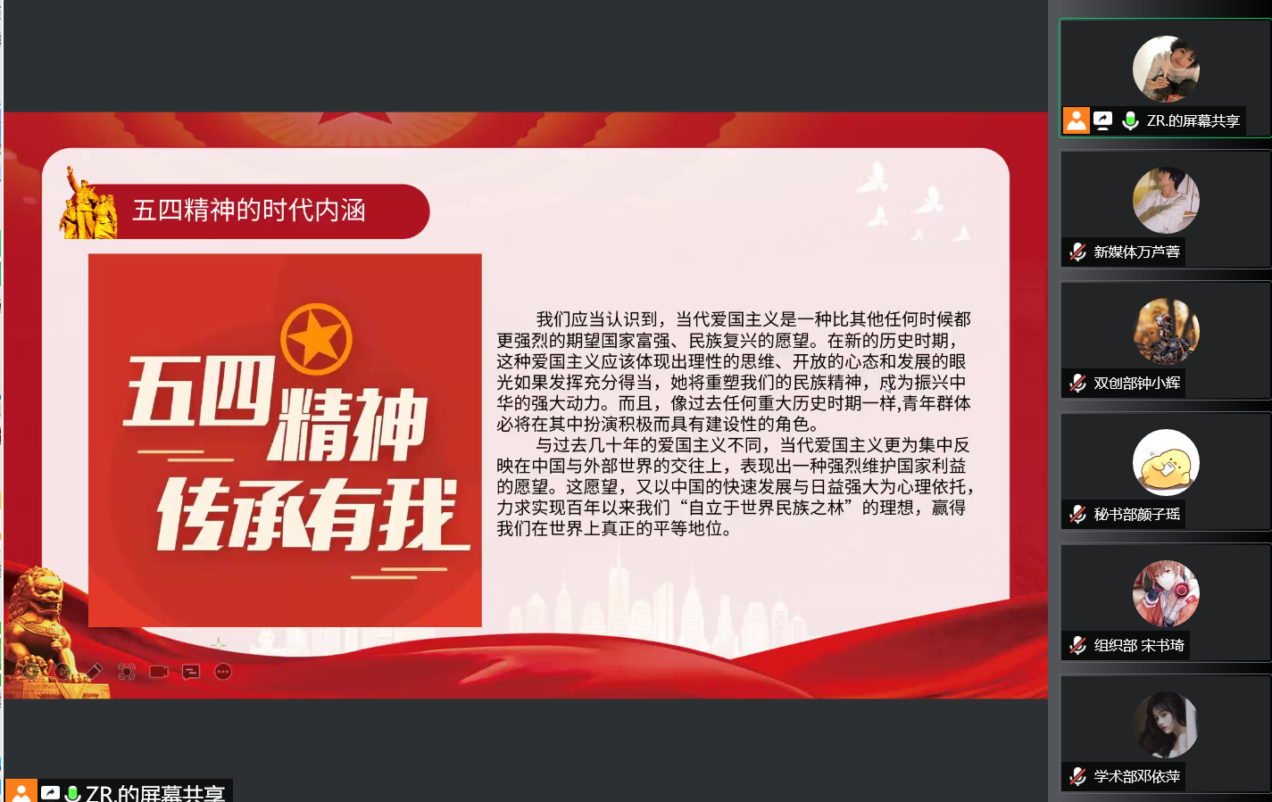 服装工程学院讯(撰稿:万芦蓉)为纪念“五四”运动,引导服装工程学院青年大学生走进百年团史,追寻信仰之光,勇担青春使命,坚定跟党走的信念,在实现第二个百年奋斗目标、实现中华民族伟大复兴中国梦的宏伟征程中展现新担当、实现新作为、建功新时代,5月5日晚7:00时,服装工程学院组织开展了“回首百年,展望未来”建团百年之日主题分享会,此次活动采用线上会议的方式进行,由张蕊蕊担任主讲。