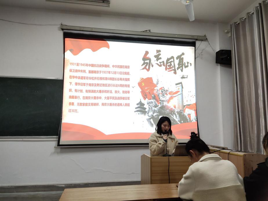 主持人王亚婷同志向大家详细的介绍了南京大屠杀的历史背景。她说,80年前的今天,侵华日军攻占南京后,烧杀奸淫,杀害中国军民30万人,惨绝人寰,震惊世界。这是人类历史上最黑暗的一页,也是中华民族永远的屈辱、伤痛和警示。“四万万人齐蹈厉,同心同德一戎衣”,野蛮、残暴的日本侵略者没有让中国人民屈服,在中国共产党的号召与领导下,中国人民同仇敌忾、共御外敌,最终赢得了抗日战争的伟大胜利,为世界反法西斯战争胜利作出了重大贡献。但这胜利的代价也是巨大的,更警示了我们落后就要挨打,御侮必先自强。