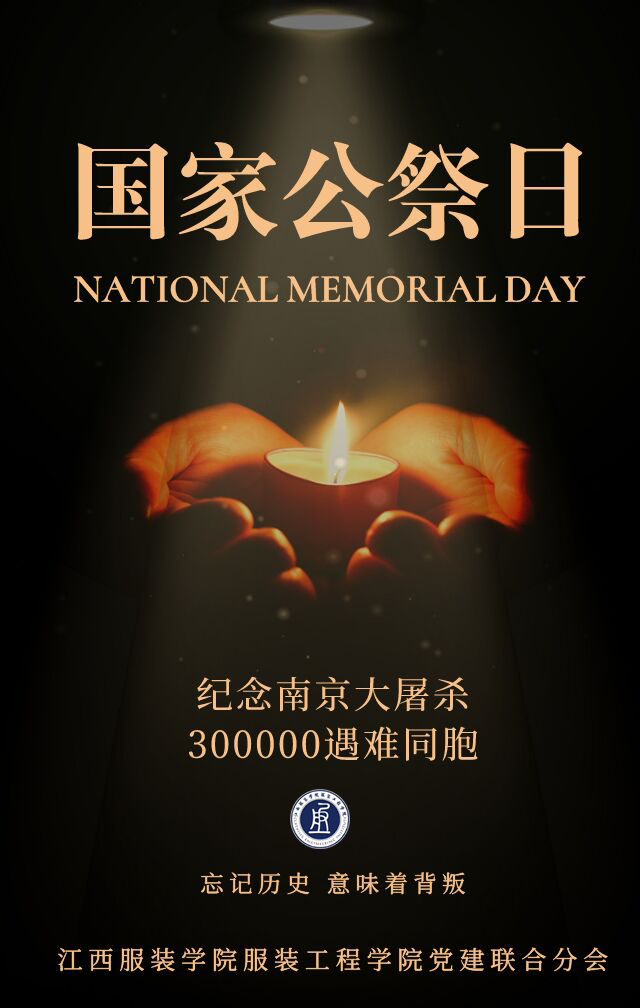 战争的硝烟已经散去,但历史不该被淡忘。国家公祭日是表达对逝者的尊重与缅怀,更是传递出要不忘历史、守护世界和平的坚定信念。作为当代大学生,我们应该铭记历史,永远记住那段屈辱的时刻,不要让历史重演,前事不忘,后事之师,牢记使命、砥砺奋进,在缅怀同胞和先烈中凝聚以爱国主义为核心的伟大民族精神,赓续实现中华民族伟大复兴的前进动力。