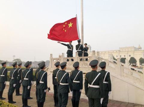 英姿飒爽的国旗护卫队队员们护送鲜红的五星红旗进场,整齐的步伐走向国旗台上。随着庄严的《中华人民共和国国歌》奏响,五星红旗在朦胧的清晨中冉冉升起,迎风飘扬。