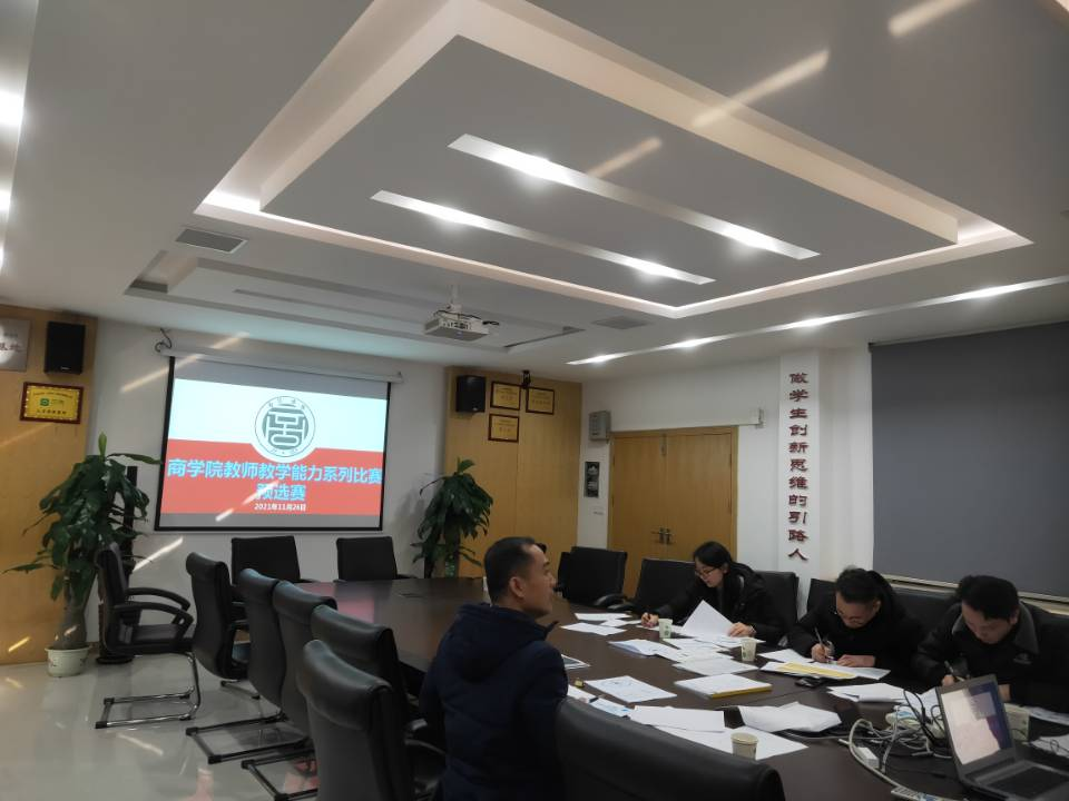 【商学院讯】为贯彻落实《教育部关于狠抓新时代全部高等学校本科教育工作会议精神落实的通知》、《教育部关于全面提高高等教育质量的若干意见》等相关文件精神,进一步提高教师教学能力,促进教师发展,搭建学校教师相互交流学习的平台,推动广大教师积极投身教育教学改革实践,钻研课程教学设计,努力吸引学生回归课堂学习,提高课程教学质量。根据《关于开展教师教学能力系列比赛活动的通知》(江服教发〔2021〕152号)及商学院教师教学能力系列比赛实施方案,2021年11月26日下午,商学院在三楼会议室开展了教师教学能力系列比赛预选赛。