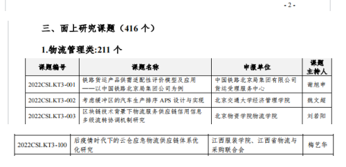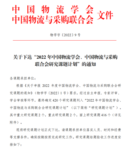 【商学院讯】为了更好的整合社会各方研究力量,拓展物流行业研究平台,整体提升物流、采购与供应链研究水平,2022年度的中国物流学会、中国物流采购联合会联合发布研究课题计划申报通知,经过专家匿名评审与在线答辩,最终确定420个研究课题列入“2022年中国物流学会、中国物流采购联合会研究课题计划”,其中安徽大学等获批重大研究课题2项,长安大学等获批重点研究课题2项,北京交通大学等单位获批面上研究课题416项。我校商学院梅艺华教授带领的智慧物流专业教学团队联合江西物流采购联合会共同申报的《后疫情时代下的云仓应急物流供应链体系优化研究》研究课题获得立项。