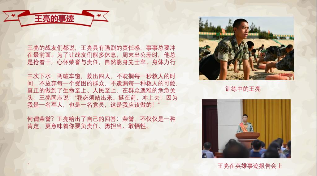 陈玉鑫同志说,王亮同志的壮举深刻诠释了听党指挥、忠于人民的信仰信念,充分展现了关键时刻顶得上来的过硬本领,生动书写了危难关头豁得出去的无畏精神,集中体现了新时代好战士视人民利益高于天、越是艰险越向前的宝贵品格,具有鲜明的时代性、示范性、导向性,作为青年预备党员,我们应学习他“人民至上、生命至上”的优秀品格,学习他“尚武精武、克敌制胜”的本领,学习他“一不怕苦、二不怕死”的战斗精神。做一名合格的预备党员,不忘初心,牢记使命!