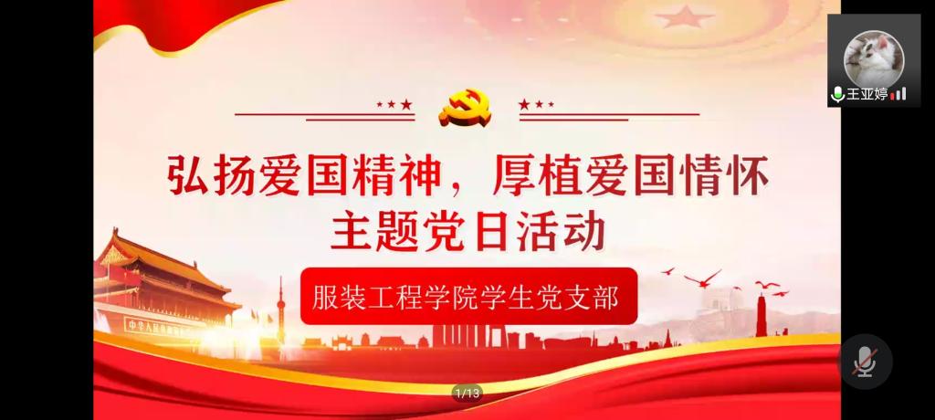 党的十八大以来,以习近平同志为核心的党中央高度重视爱国主义教育,书写了中华民族爱国主义精神教育新的辉煌篇章。为加强思想引领,进一步推进爱国主义主题教育,10月14日晚19时许,服装工程学院学生党支部在线上开展了以“弘扬爱国精神,厚植爱国情怀”为主题的党日活动。