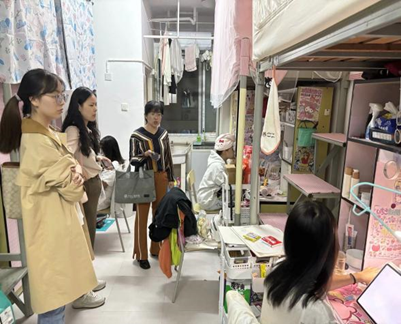 为进一步落实学生宿舍安全管理,消除宿舍安全隐患,加强对校外住宿学生安全管理,营造良好的生活环境和学习氛围。近日,服装设计学院党委副书记周洪英带领全体学工人员走访学院学生寝室和校外学生住所,查看他们的生活状况,开展常规查寝工作,为我院的学子送去关怀和温暖。