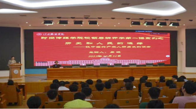 (时尚传媒学院讯 孙凡雅撰稿)为切实做好思想政治教育工作,进一步推动习近平新时代中国特色社会主义思想进教材,进课堂,进头脑。2023年10月31日下午,时尚传媒学院在思贤楼三楼报告厅及图书馆一楼展演厅,组织开展校领导讲开学第一课活动。本次活动邀请了校长助理易城,以“历史和人民的选择-中国共产党人所肩负的使命”为主题为学院全体2023级新生进行授课。