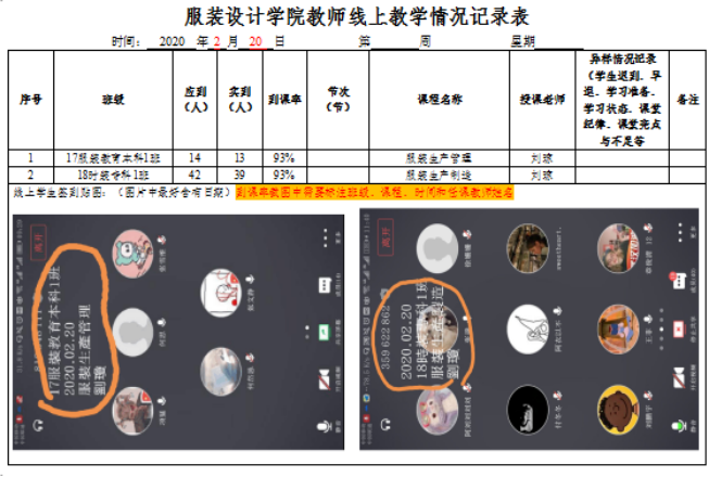 :线上教学给教学督导带来的新问题和新挑战,服装设计学院通过腾讯会议进行院部研讨后,于2020年2月18日发布了服装设计学院防疫期间在线教学质量监控预案,采取层层压实责任,结合课程教学实际,制定切实可行的实施细则,为线上教育教学保驾护航,确保"学生学习不延误、课程质量有保障"。