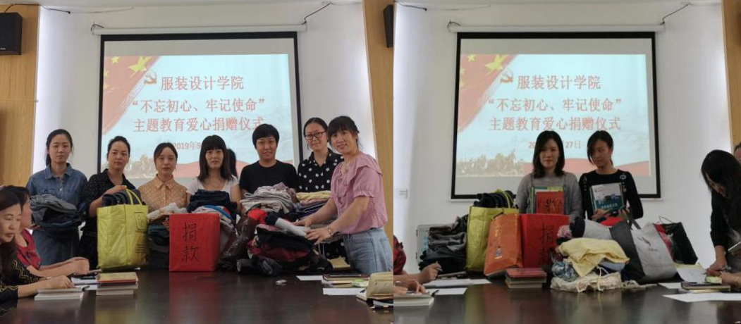 服装设计学院讯(记者 李晶晶)2019年9月27日13:30,西一栋四楼会议室,服装设计学院教师党支部组织“不忘初心、牢记使命”主题教育爱心捐赠活动,学院党总支副书记邓良峰、王春梅同志,学院教师党支部书记刘琼同志及学院教师党员参加爱心捐赠。