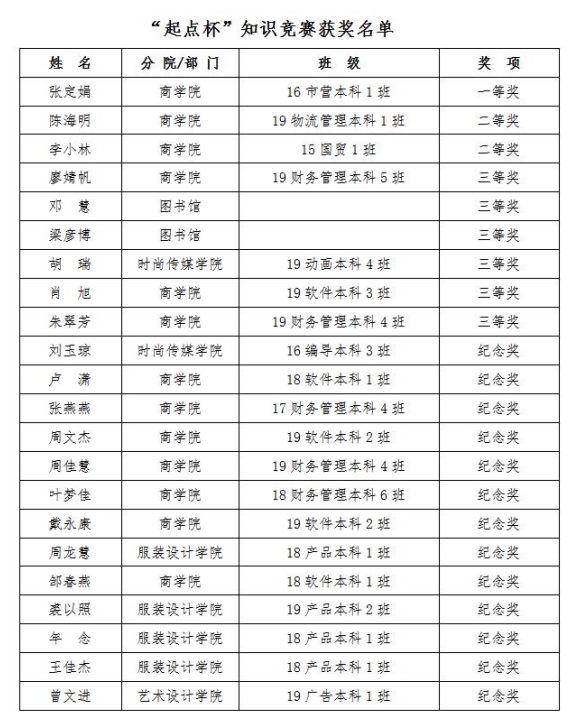 服装报讯 11月19日下午,图书馆“起点杯”品读红色经典、共享全民阅读知识决赛及颁奖仪式在图书馆三楼学术视频视听厅举行。本次活动得到了北京智联起点信息技术有限公司的大力支持。活动由图书馆副馆长兰志玲主持。