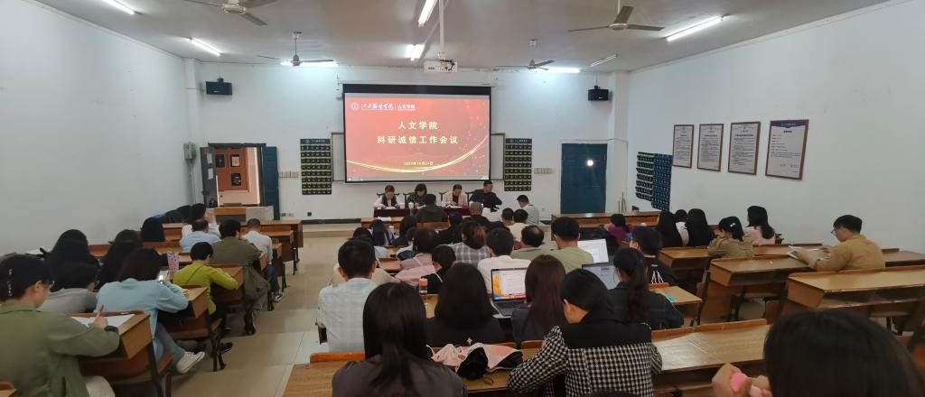 (人文学院讯刘赛球撰稿)为深入贯彻党的二十大精神和习近平总书记关于科技自立自强的重要论述,落实省教育厅关于加强科研诚信建设的相关要求,落实我校关于科研诚信建设的相关部署,营造风清气正、求真务实的良好学术生态和科研环境,建成覆盖全面的科研诚信信息系统,学院于10月24日中午1点在艺术楼107召开科研诚信工作会议。学院领导班子及全体教师参加了本次会议,会议由副院长陈家华主持。