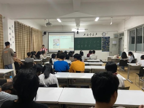 在围绕“防盗”展开的第二个板块,辅导员简述了有关宿舍防盗的注意事项,并更进一步地邀请同学们积极发言,在防盗的相关措施中查缺补漏,提供一些基于个人经验与知识的防盗方法。在紧接其后的“卫生安全”板块,辅导员倡导同学们要时刻保持宿舍的干净整洁,禁止饲养宠物,并通过列举饲养宠物的四大危害与倡导保持宿舍环境卫生的四大举措,以及展示相关处罚规定,帮助同学树立正确的宿舍环境安全意识。会议尾声,辅导员希望同学们牢固树立宿舍安全意识,宿舍成员间相互监督、学习与帮助,争做文明寝室,共营馨和宿舍。