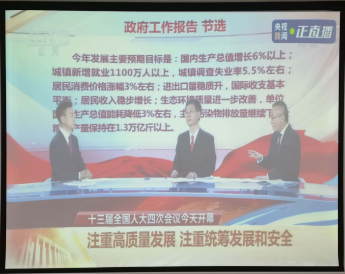 会议伊始,栗战书宣布:第十三届全国人大第四次会议开幕。随后,由国务院总理李克强代表国务院向大会作政府工作报告,请人大代表审议,并请政协委员提出意见。报告主要回顾了我国奋力夺取2020年疫情防控以及经济社会发展双胜利,并明确了“十四五”时期以及2021年经济社会发展的主要预期目标和重大任务,提出了相应的措施。政府工作报告以翔实的数据说明了我国经济发展结构不断优化,三大攻坚战取得初步成效,人民生活水平持续提升,使学生进一步增强了“四个自信”,增强了为实现社会主义现代化国家而奋斗的使命感和社会责任感。