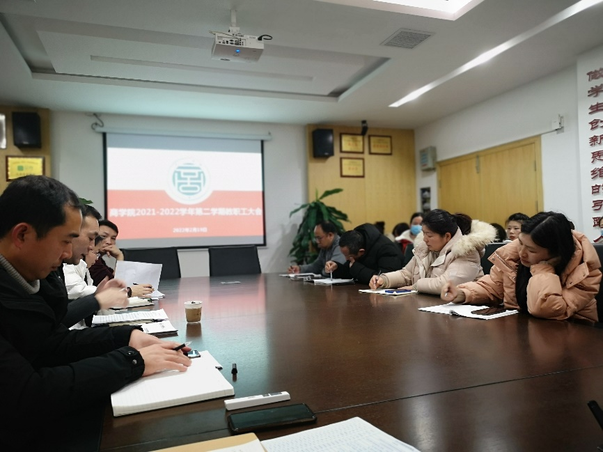 【商学院 讯】新学期,新起点,新征程,2022年2月19日下午14:30,商学院在学院会议室召开了全体教职工大会。副校长李宝君、学院党政领导班子、全体教职工参加了会议。会议由学院党总支书记黄晶磊主持。