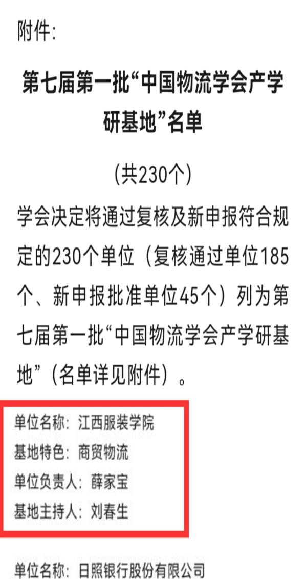 在学校领导的大力支持下,以商学院刘春生老师为基地主持人,以数字物流与服装供应链研究中心校级科研平台及学院相关学科教师为基地成员组建项目团队,并与江西省物流与采购联合会专家共同进行前期调研,凝练申报材料,于2022年2月25日向中国物流学会提交项目申报书。经过自主申报、专家评审、学会审核等程序,于2022年4月25日通过评审公示,2022年12月5日正式获批中国物流学会第七届第一批“商贸物流”产学研基地。