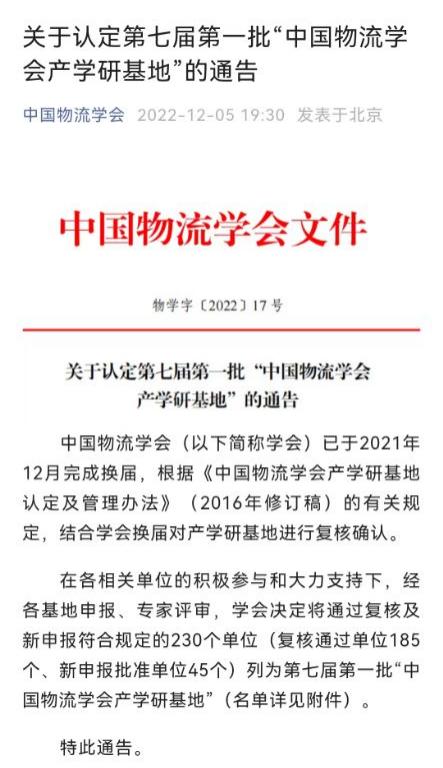 【商学院讯】近日,中国物流学会公布第七届第一批中国物流学会产学研基地名单,我校商学院刘春生老师作为基地主持人的“商贸物流”产学研基地顺利通过专家评审,获批中国物流学会第七届“商贸物流”产学研基地。此次新申报的包括天津理工大学、同济大学、万象城平台在内的共44家单位获批立项。