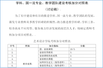 为了有效推动学科建设,学院草拟了“学科、国一流专业、教学团队建设考核加分对照表”方案,要求参会人员进行讨论方案设计的合理性,科学性,其目的是让教师知晓年终考核有加分项目,引导骨干教师教学研究向高质量发展,最终目的是年末全面完成学科建设各项指标。