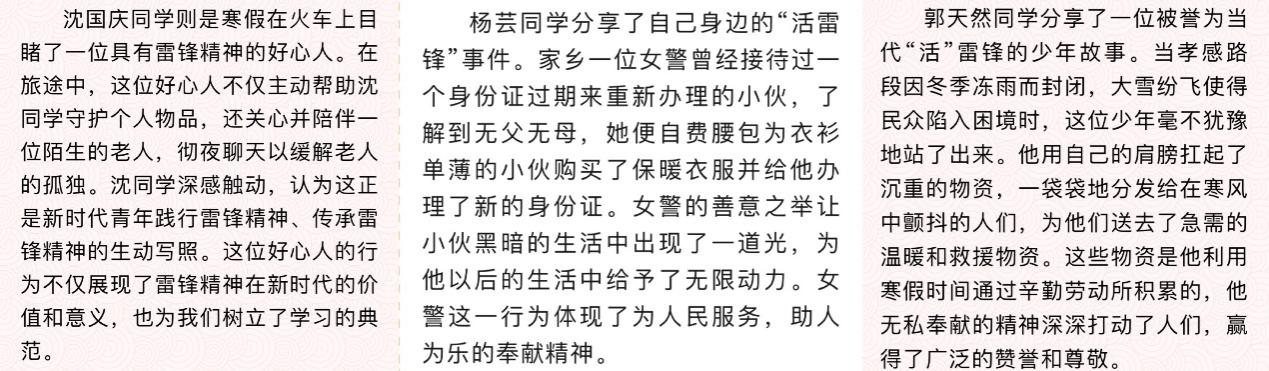 2024年3月,学院党委组织全体党建成员举行“学雷锋精神,追璀璨微光”主题活动。活动以平面海报设计和故事分享的形式开展,旨在传承与弘扬雷锋精神。同学们纷纷用画笔绘制心中的雷锋形象,将无私奉献、助人为乐的精神融入海报设计之中。同时大家也积极分享雷锋事迹,用故事传递正能量,激励彼此在日常生活中践行雷锋精神,共同营造和谐美好的校园环境。下面让我们来欣赏一下同学们的优秀作品吧。