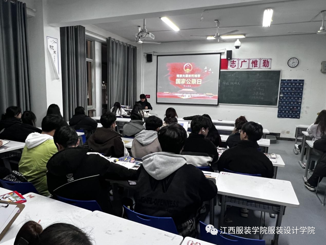 2023年12月13日,是我国第十个国家公祭日。为了悼念南京大屠杀遇难同胞,缅怀革命先烈,教育引导学生铭记历史。服装设计学院各班级于教室开展“缅怀先烈,勿忘国殇”国家公祭日主题教育活动。
