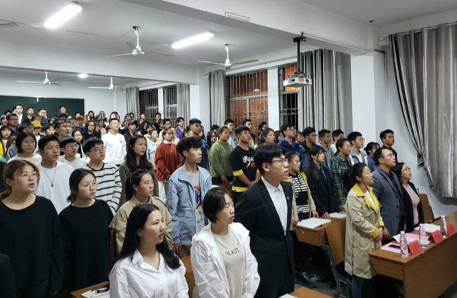 服装设计学院讯(记者 史佳惠)为了更好的高举习近平新时代中国特色社会主义思想伟大旗帜,冲刺我校本科教学工作合格评估和营造优良学风。服装设计学院于10月18日晚在主教楼126召开了本科教学工作合格评估誓师大会。学院党总支副书记邓良峰、王春梅,学工办副主任张敬玲、全体辅导员及学生干部参加了本次誓师大会,大会由张敬玲副主任主持。