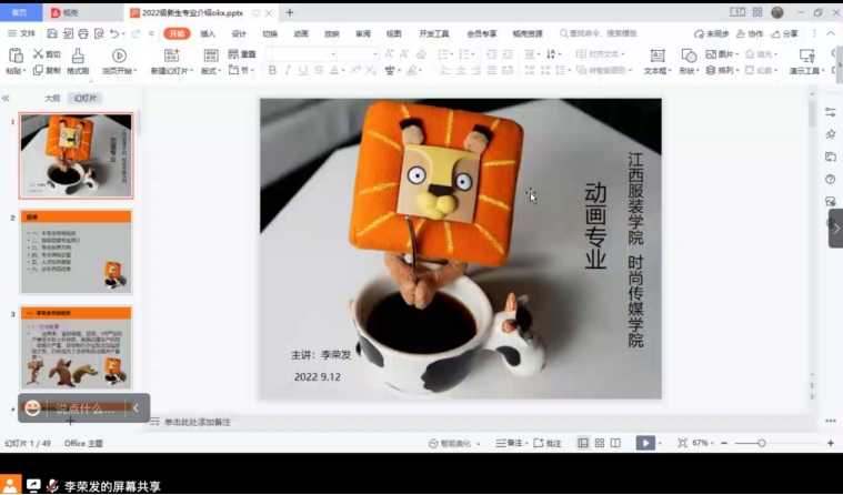 动画教研室主任李荣发介绍了动画专业大学四年的专业课程设置和课程学分分配,这些课程分为基础课模块、能力模块、能力拓展模块和实践教学模块,满足同学们对造型和色彩基础能力的提升,对二维和三维动画制作流程的熟悉和应用,对将来的实际工作能力的实践。李主任希望同学们在未来的四年完成这一系列专业学习后,能够顺利在影视动画制作及电视传媒行业、广告传播等商业制作公司,游戏、网络动画等互联网互动娱乐领域,手机游戏、手机动漫等无线娱乐领域从事动画设计师、动画原画设计师、动画模型设计师、动画衍生产品设计、影视后期特效师、新媒体设计等相关工作。同时,李主任提出了动画专业的市场现状暂时处于一个供不应求的状态,动画和虚拟现实行业的人才需求量也是逐年在增加,希望同学们可以在未来的四年学习生活中认准目标,学好专业技术,鼓励新生树立正确的人生目标,制定成长的可行方案,持之以恒,实现理想,希望大家“学会学习”“学会做事”“学会做人”,谱写出美丽多姿的大学新生活。