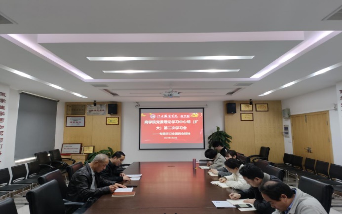 商学院讯为学习贯彻党的二十大精神和习近平新时代中国特色社会主义思想,加强党的理论建设,提高党员干部的政治素质和理论水平,2024年3月22日,商学院全体党委委员、辅导员于商学院会议室召开商学院党委理论学习中心组(扩大)第二次学习会,专题学习全国两会精神,此次会议由商学院党委书记黄晶磊主持。
