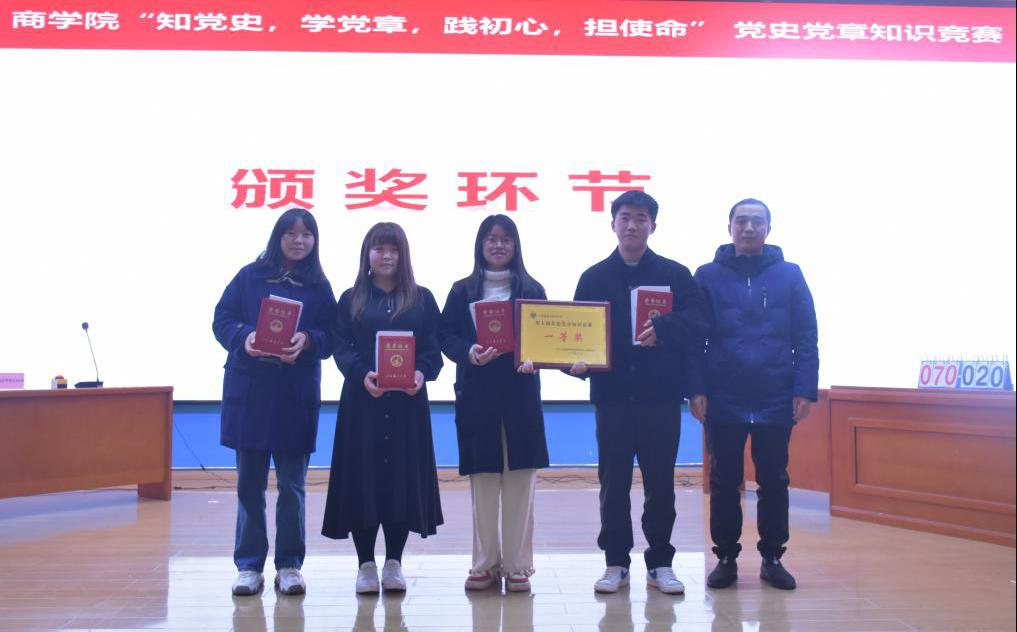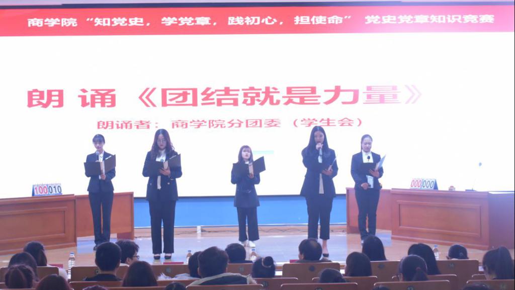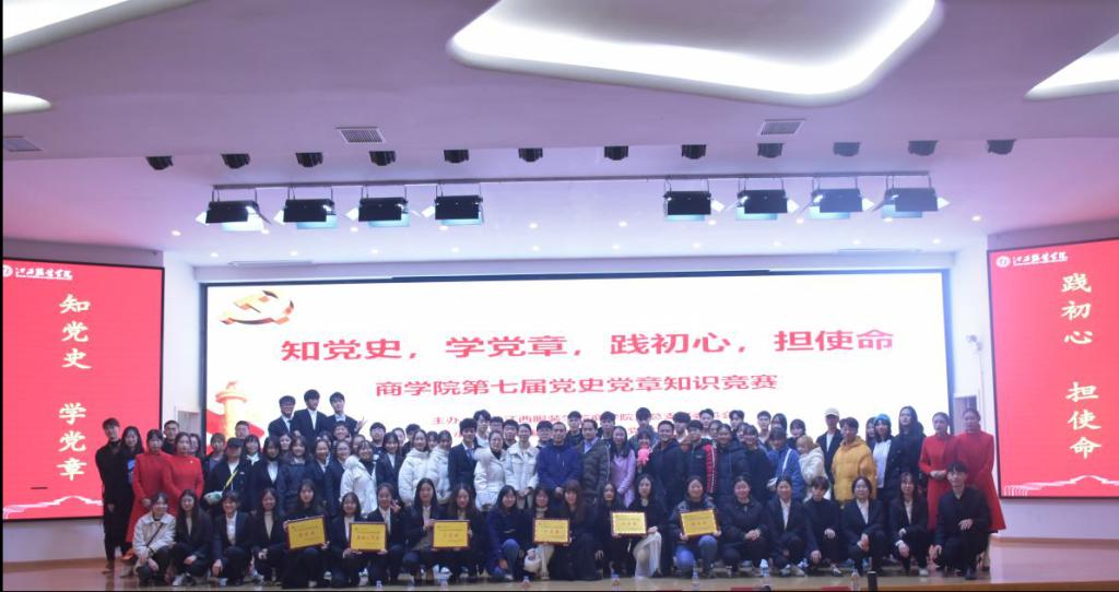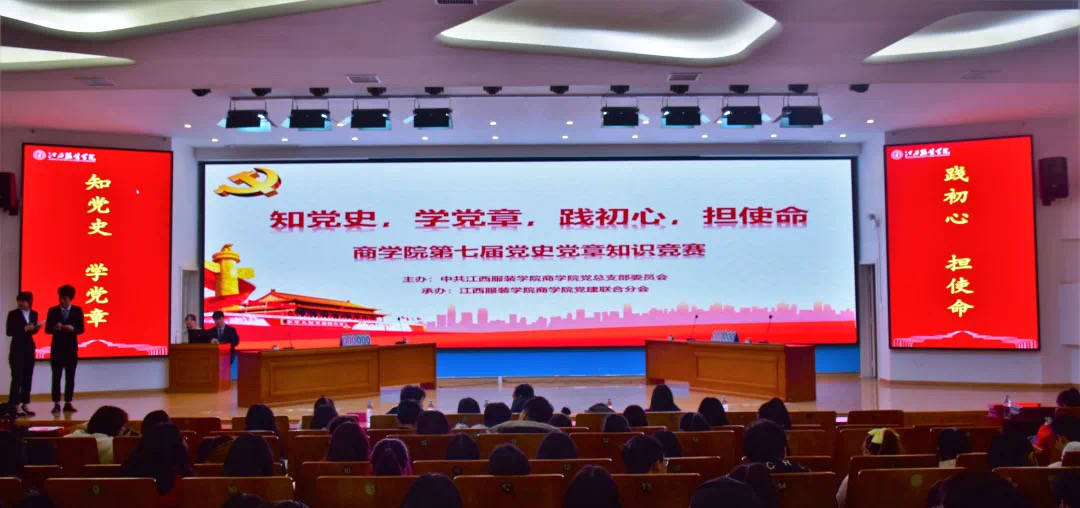 为纪念中国共产党成立99周年,重温中国共产党光辉历程,厚植爱党、爱国情怀,进一步激发青年大学生学习党史党章的热情。2020年12月10日晚18:30,万象城平台商学院在思贤楼报告厅举行“知党史,学党章,践初心,担使命”第七届党史党章知识竞赛。莅临比赛现场的领导老师有商学院党总支书记黄晶磊书记、商学院学生党支部书记欧阳耀诚书记以及商学院全体辅导员,20级全体新生参与,本次大赛由廖佳敏、何夏伟主持。